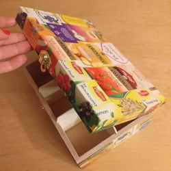 Akrylmalt, pyntet te skrin med gullfarget lås. Tekst i lokk: "Come let us have a cup TEA and continue to talk about happy things". Tekst på fremside: "a cup of tea makes everything better". Innvendig er 6 adskilte rom til te poser. Renhold: Skrinet er lakkert og kan tørkes av med en lettere fuktig klut.